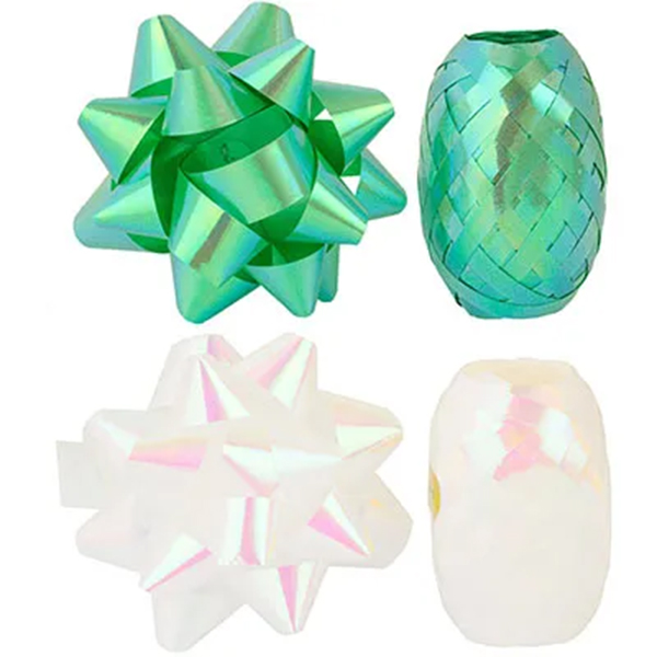 Набор для упаковки подарков: бант звезда 7см 2шт + лента 10м 2шт, Дуо перламутровый/зеленый, пластиковая упаковка, европодвес