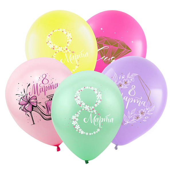 Надписи на воздушных шарах: "8 марта", "Сияй".