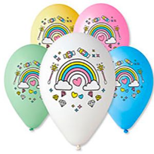 Шар латексный с рисунком 12"/30см Единорог Радуга, с облачками, сердечками, звездочками, конфетами и другими волшебными элементами