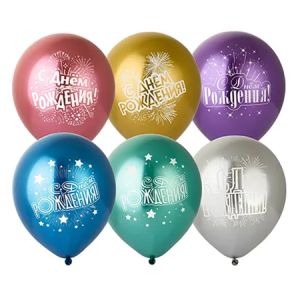 Шар латексный хром с рисунком 12"/30см С Днем рождения! Салют, ассорти из 6 цветов, 5 дизайнов