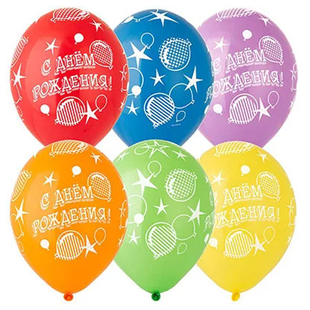 Шар латексный шелкография 14"/36см С Днем рождения! Шары, звезды, ассорти из 6 цветов