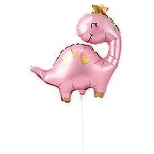 Шар фольгированный фигурный 14"/36см Динозаврик в короне розовый на палочке, крепится с помощью розетки на палочку