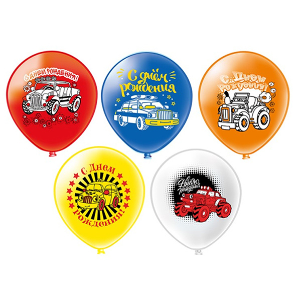 Шар латексный с рисунком 12"/30см С Днем рождения! Машинки, ассорти из 5 цветов, 5 дизайнов