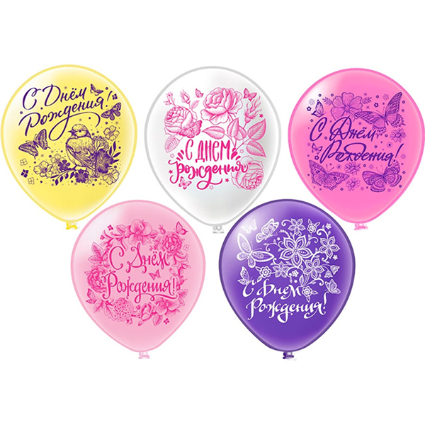Шар латексный с рисунком 12"/30см С Днем рождения! Бабочки, ассорти из 5 цветов, 5 дизайнов