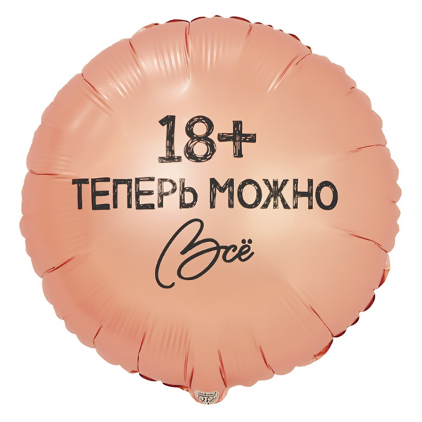 Фольгированный шар с игривой надписью «18+ Теперь можно всё!» — забавный и запоминающийся подарок для празднования совершеннолетия или тематической вечеринки. Шар продаётся в сдутом виде. Рекомендуем надувать его гелием. Размер надутого шара — 45 см. Не забудьте привязать шар к грузику, чтобы он не улетел. Изготовлен шар из фольгированной плёнки, благодаря чему держит форму более двух дней.