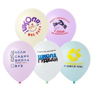 Шары из натурального латекса c шелкографическими рисунками на тему школьного выпускного выпускного. В наборе используются 5 дизайнов, нанесенных на шары 5 цветов шаров типа макарун - нежно-пастельный оттенок цвета. Рисунок расположен с одной стороны шара. При нанесении рисунка используются две различные краски в зависимости от цвета шара. Предназначены как для использования в розничной продаже, как в надутом, так и в не надутом виде, в соответствующий период времени, так и для оформлений шклоьного выпускного праздника.