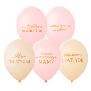 Высококачественный шар из натурального латекса. Нежные шары и розовые, одного типа - пастель - матовый оттенок цвета. Шары с двусторонним шелкографическим рисунком и надписями: Мамочка Love you. Мам, ты лучшая. Счастье иметь такую маму. С любовью и нежностью. Единственной на свете. Идеальный ассортимент для розничной продажи воздушных шариков и украшения праздника. Воздушные шары изготавливаются из экологически безопасного 100%-ного натурального латекса. В окружающей среде разлагаются на безопасные компоненты примерно с той-же скоростью, как обычные листья деревьев. После использования лопнуть и утилизировать как бытовой отход. День матери. 8 Марта.