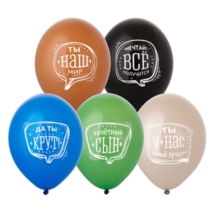 Высококачественный шар из натурального латекса. Пастель - матоввые шары, с двухсторонним шелкографическими текстовыми рисунками-пожеланиями для сыночка, с большим полем печати: Зачетный сын. Да, ты крут! Ты наш мир. Ты у нас самый лучший. Мечтай, всё получится. Идеальный ассортимент для розничной продажи воздушных шариков и украшения праздника. Воздушные шары изготавливаются из экологически безопасного 100%-ного натурального латекса. В окружающей среде разлагаются на безопасные компоненты примерно с той-же скоростью, как обычные листья деревьев. После использования лопнуть и утилизировать как бытовой отход.