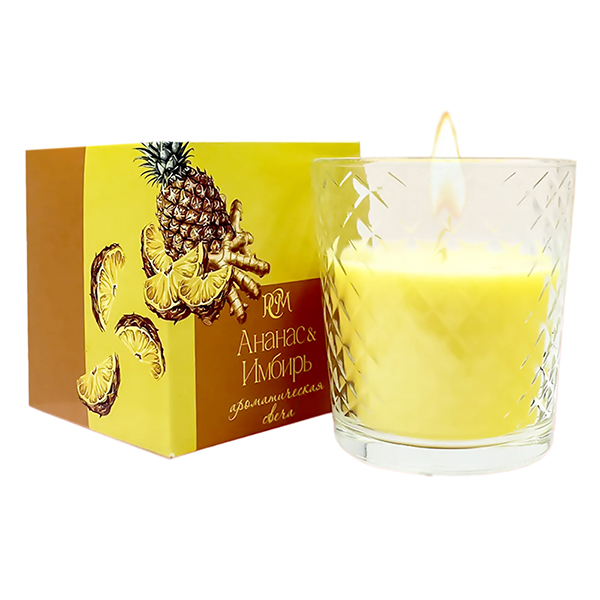 Свеча ароматизированная в стакане " РСМ " Ананас и Имбирь, 77*83мм, время горения 30часов, глянцевая картонная коробка