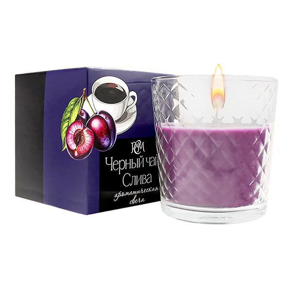 Свеча ароматизированная в стакане " РСМ " Черный чай и Слива, 77*83мм, время горения 30часов, глянцевая картонная коробка
