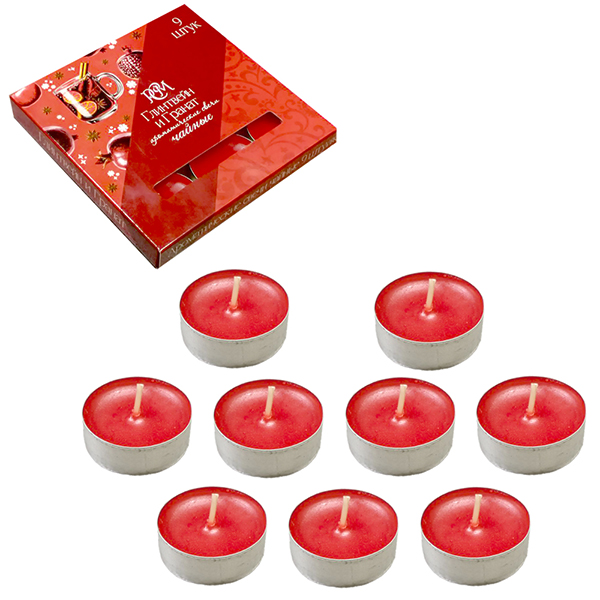 Свеча чайная Новогодняя ароматизированная " РСМ " 9шт Глинтвейн и гранат, 39*12,5мм время горения 3-4часа, картонная упаковка