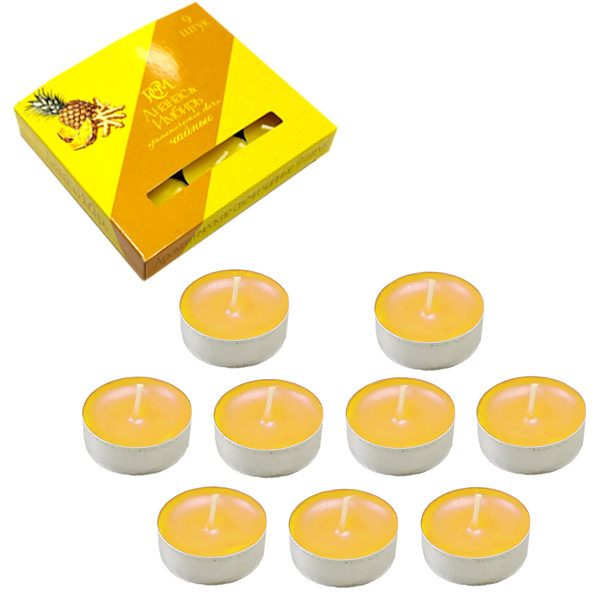 Свеча чайная ароматизированная " РСМ " 9шт Ананас имбирь, 39*12,5мм, время горения 3-4часа, картонная упаковка