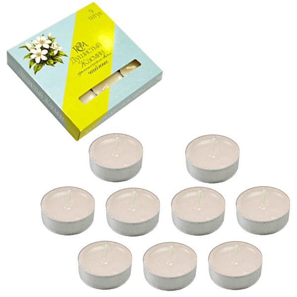 Свеча чайная ароматизированная " РСМ " 9шт Душистый жасмин, 39*12,5мм, время горения 3-4часа, картонная упаковка